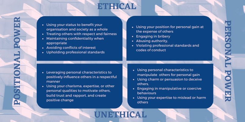 Ethical use of Positional Power involves using your position/status/power in a responsible manner that benefits people, the organisation, its stakeholders, and/or society as a whole. You may already use this to ensure others are treated with respect and fairness, maintaining confidentiality when appropriate, avoiding conflicts of interest, and upholding professional standards. On the flip side, unethical use of Positional Power could involve using your position for personal gain at the expense of others.