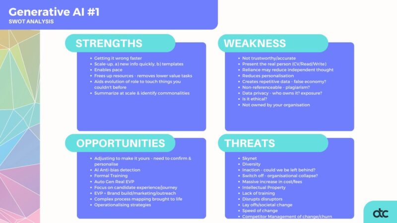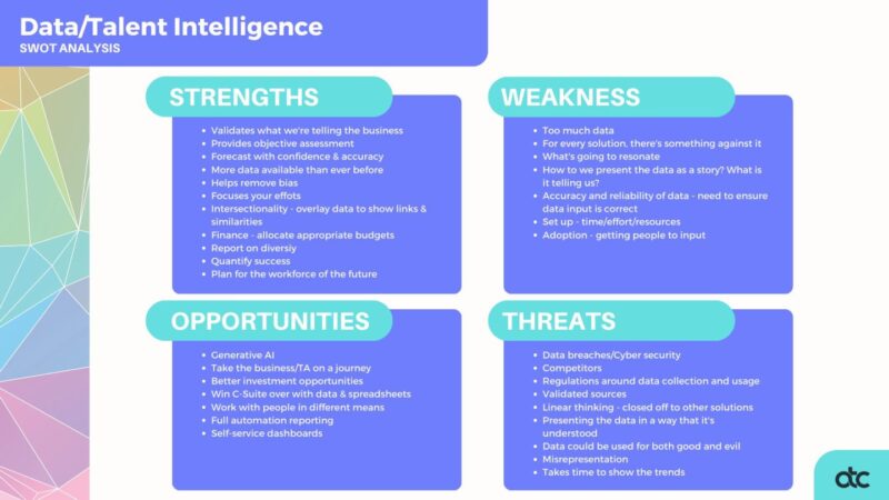 It wasn’t hard to then switch gears and identify the threats that “doing nothing” in terms of change posed to talent functions,  with many of the group currently feeling somewhat vulnerable in their current state of operating. The weaknesses and threats posed significant negative impacts to all stakeholder groups being – the TA team, candidates, the business and of course the potential reputational impact on the business brand externally and the internal TA functions brand.