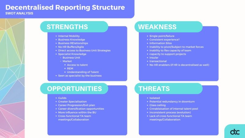 The SWOT analysis exercise was really interesting – my table covered the difference of having a centralised TA function housed within HR or P&C vs. having a decentralised TA function that reports directly into the business (or business units).
