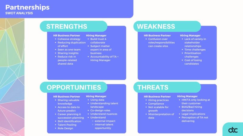 Taking time out to conduct a good old SWOT analysis is always a really useful exercise and this one was no different. However, with our minds firmly on moving towards Advisory, it’s safe to say it took a moment to get moving on why talent functions should stay in the current state lane and stick with “Talent Acquisition.”