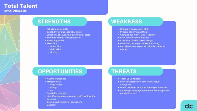 The complete SWOT analyses below and their accompanying commentary from the discussion leaders provide valuable insights around these considerations and can be used as a tool to assist you in your own journey towards Talent Advisory.