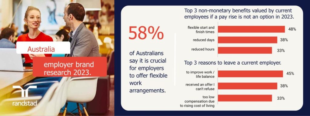 Multi-year research conducted by Randstad shows flexible working arrangements have been a focus for Australians for years. Our annual employer branding research has been running for over 20 years and well before the pandemic, Australians said they valued ‘work life balance’ above all other elements of an employment offering – even ‘salary’. In preceding years, Australia was the only country out of 30 surveyed that returned this result. We have always put a high price on flexibility and work life balance. Industry sectors such as childcare and the public sector are seen by respondents to be some of the most attractive employment destinations in Australia, in no small part due to the perceived flexibility offered.