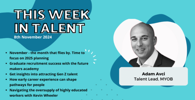 This Week in Talent: future planning and graduate recruitment is top of the list for Adam this week, sharing his experience at MYOB’s future makers academy and his top tips for making an assessment day work. Did he back a winner at the Cup? Pretty sure it was a roughie. Read on.