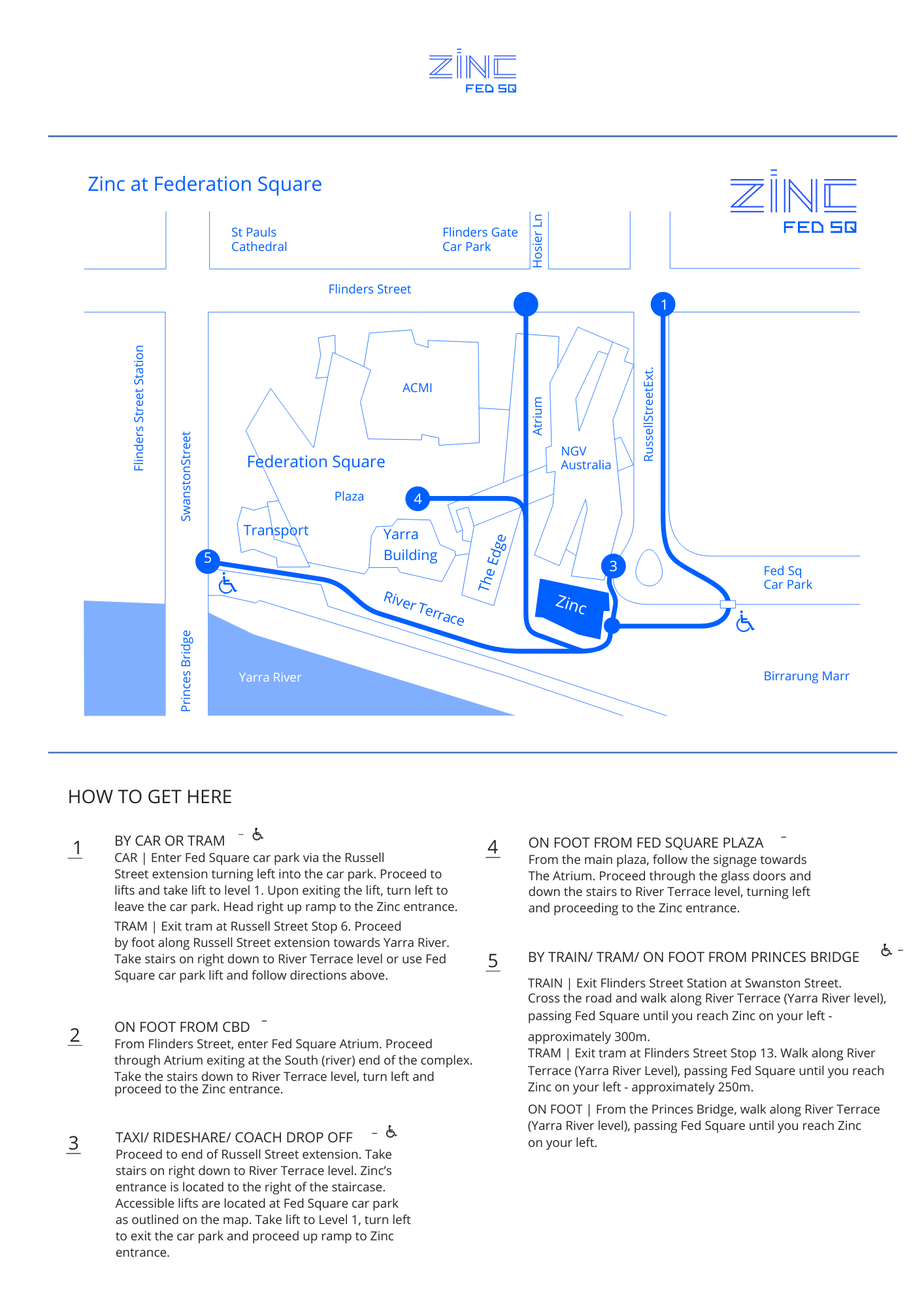 Click here to download a copy of the Fed Square Precinct Map with directions on how to get there; or here for a map of all the facilities within Fed Square Precinct.