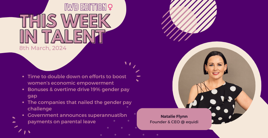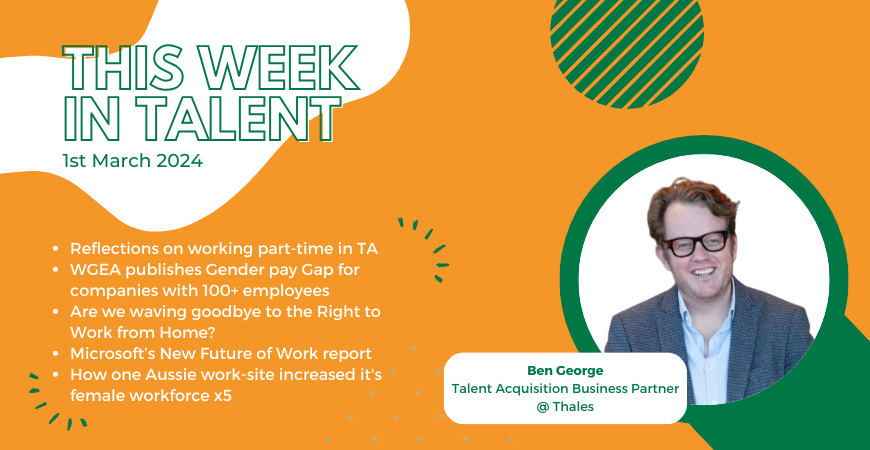 This week in Talent: personal reflections on shifting to a part-time Talent role, the WGEA publishes gender pay gaps for 100+ companies, a potential "bye-bye" to the right to work from home, the employers with the biggest and smallest gender paygaps, Microsoft's New Future of Work report, how one Aussie work-site increased its female workforce x5, and more!