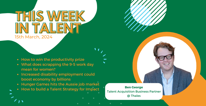 This week in Talent: how to make part-time TA work for you, how to win the productivity prize, what does scrapping the traditional 9-5 working hours mean for women?, increasing disability employment to boost economy by billions, Hunger Games hits the Aussie jobs market, and more!