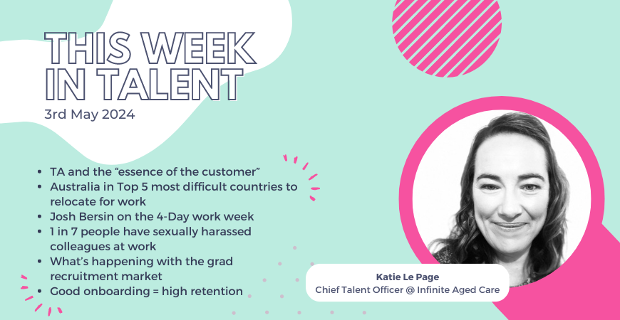 This week: why TA needs to focus on "the essence of the customer," Australia in the Top 5 most difficult countries to relocate to for work, more arguments for the 4-Day work week, 1 in 7 people admit to sexually harassing colleagues at work, how effective onboarding impacts retention, and more!